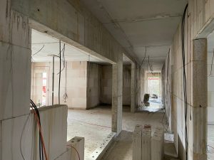 Die Schallungsträger und Stützen für die Verlegung der Deckenelemente des Dachgeschosses wurden vollständig aufgestellt und der Treppenlauf wurde eingebaut.